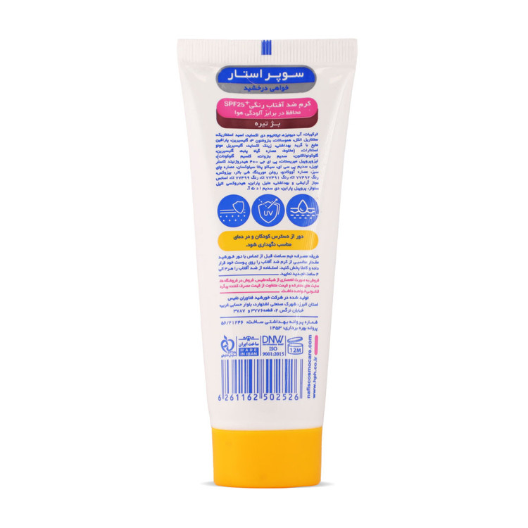 ضدآفتابهای رنگی سوپراستار، با خاصیت ضدآلودگی هوا ضمن محافظت کامل از پوستتان در مقابل اشعههای مضر نور خورشید و همچنین آلایندههای محیطی، بخاطر داشتن خاصیت کرمپودری، میتواند یک پوشش قوی بر روی پوست شما ایجاد کند. وجود حجم بالای آنتیاکسیدان در این محصول باعث میگردد که عوارض ایجاد شده از نور خورشید و آلودگیهای محیطی رفع گردد.
