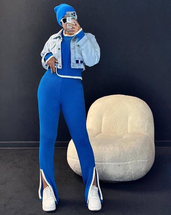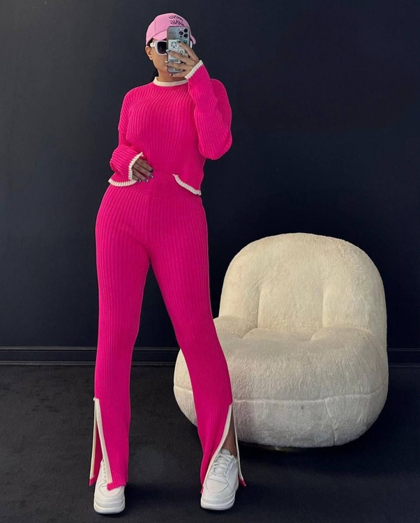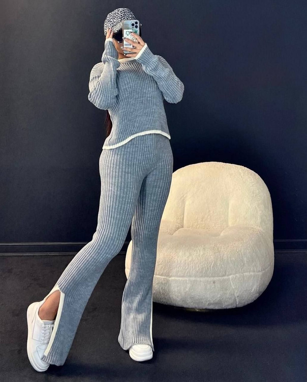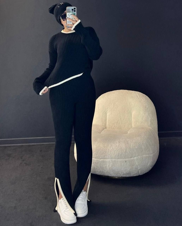 L ست بلوز شلوار بافت چاک دار خط سفید