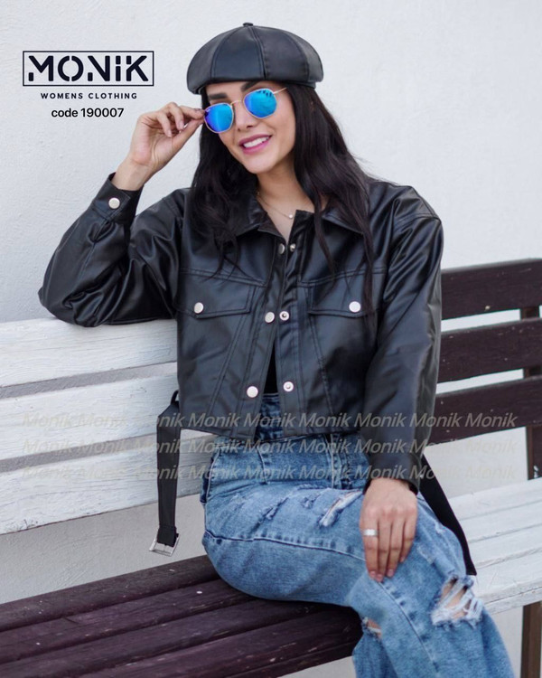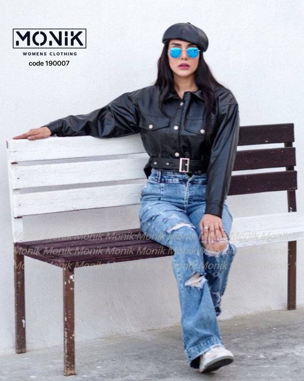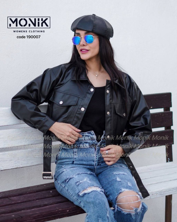 کت تک چرم کوتاه مشکی کمربند دار کد 190007