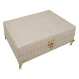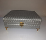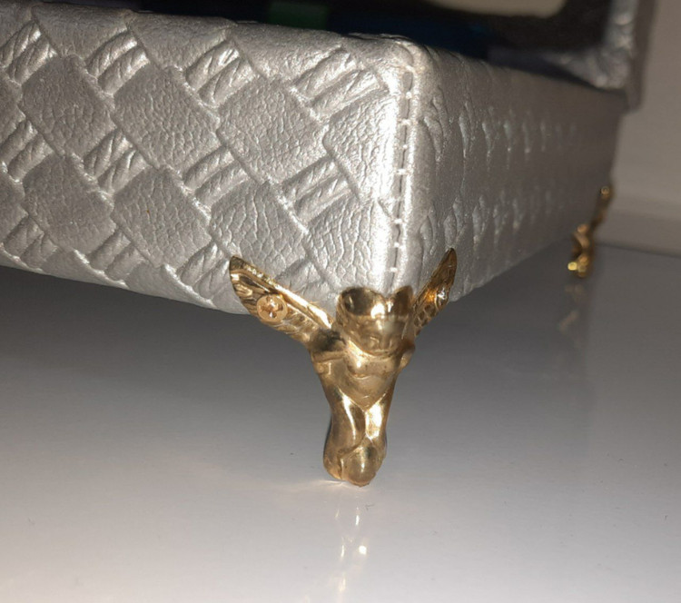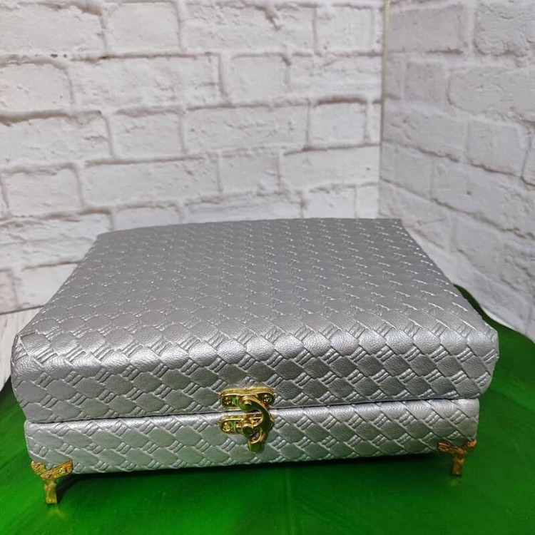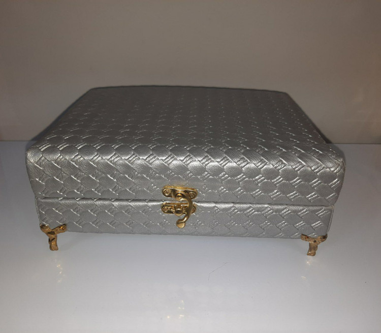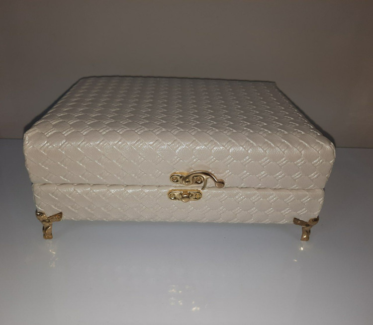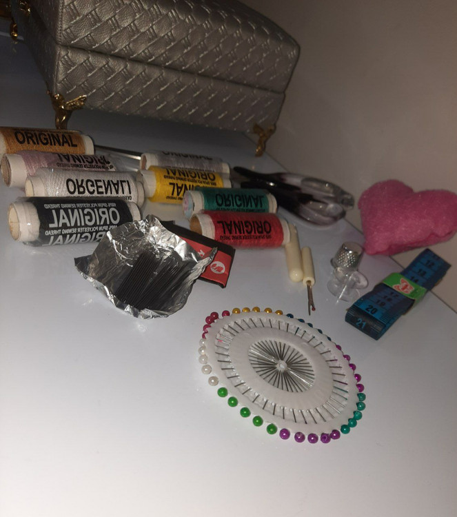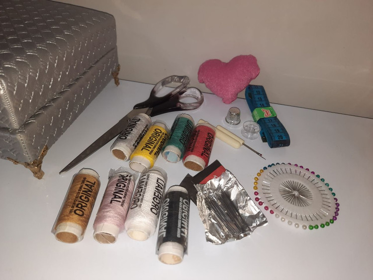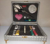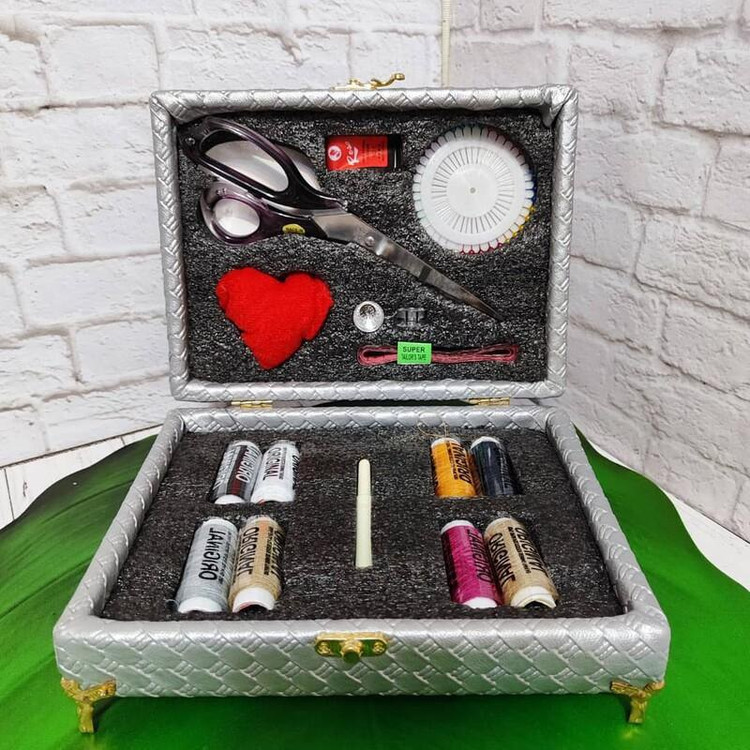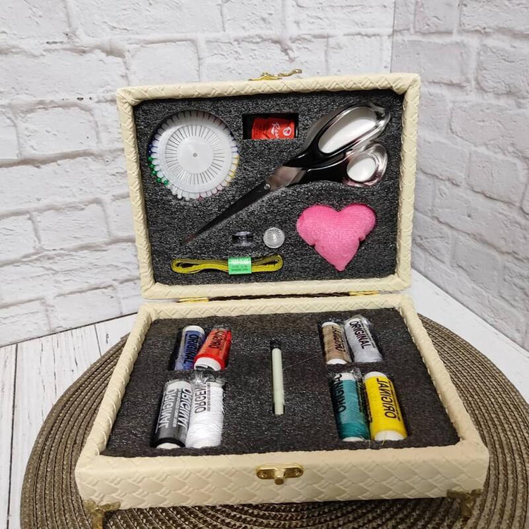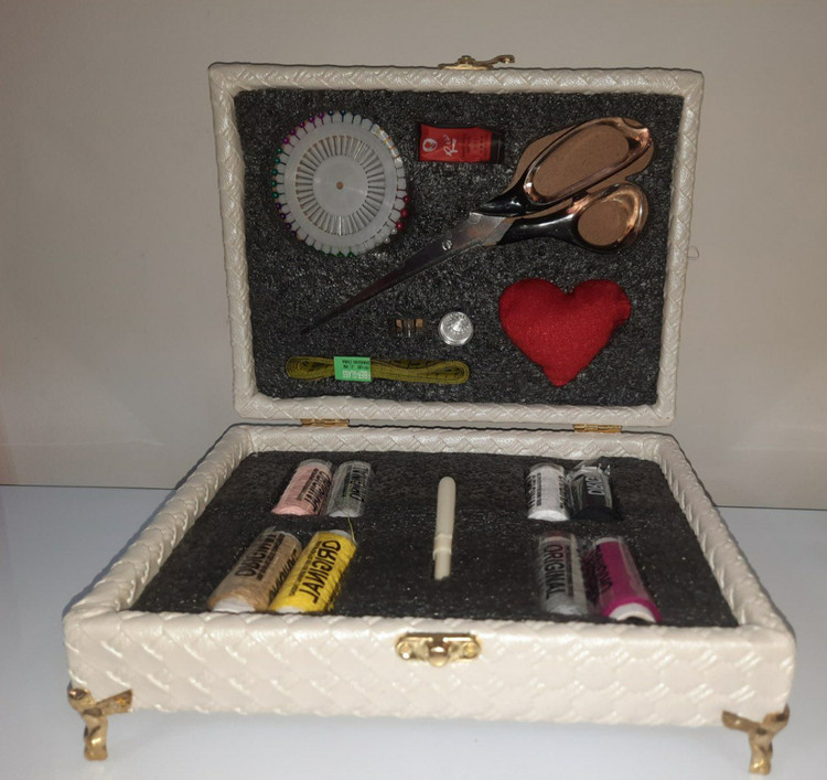 جعبه چوبی با رویه چرمی و پایه های طلایی داخل جعبه شامل :8عدد قرقره،یک عدد متر، یک عدد قیچی ،یک عدد انگشت دانه، یک عدد ماسوره، پک سوزن ته گرد رنگی، پک سوزن خیاطی و جا سوزنی قلبی بشکاف