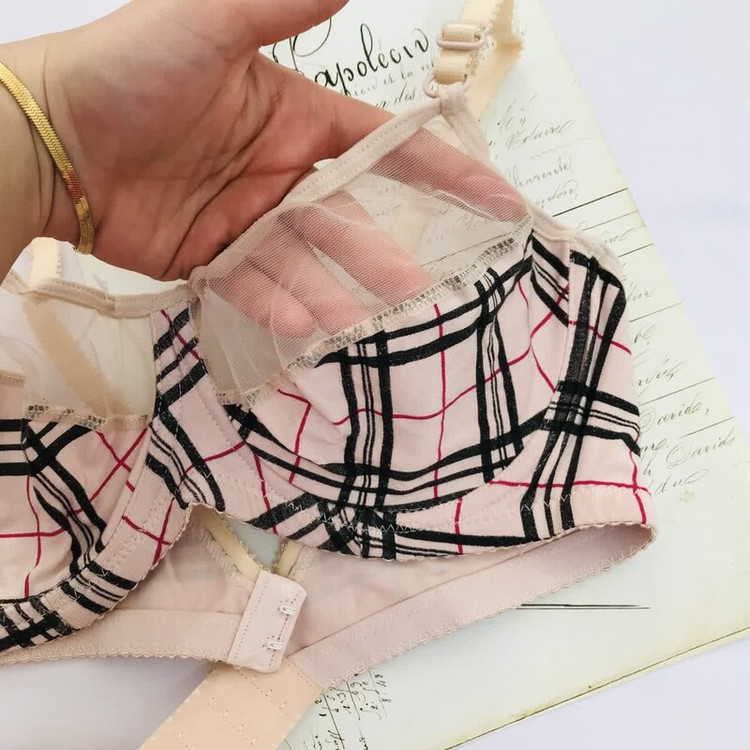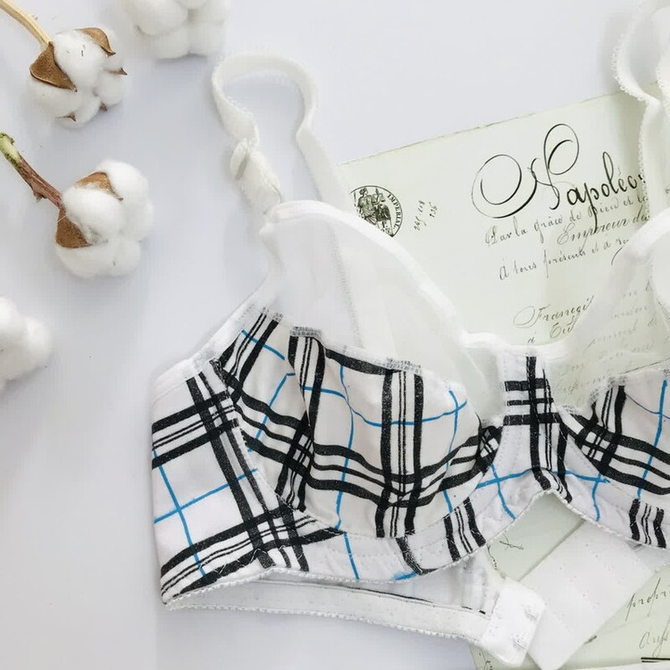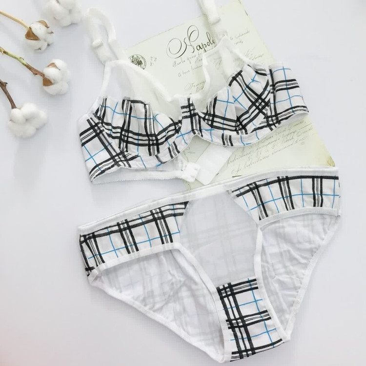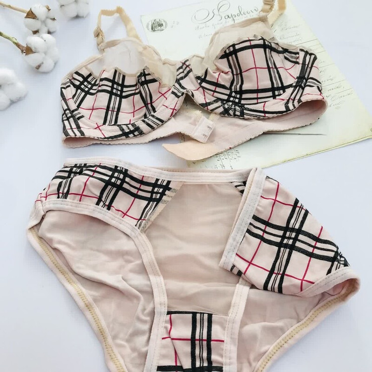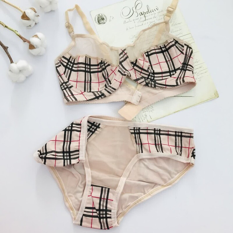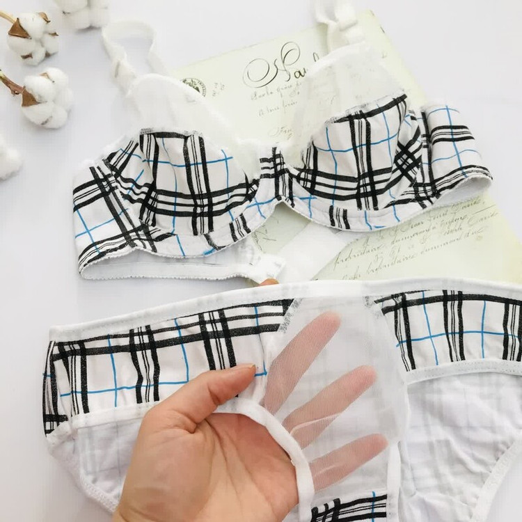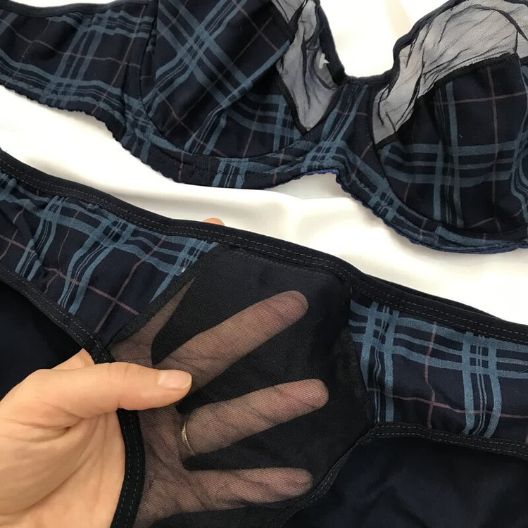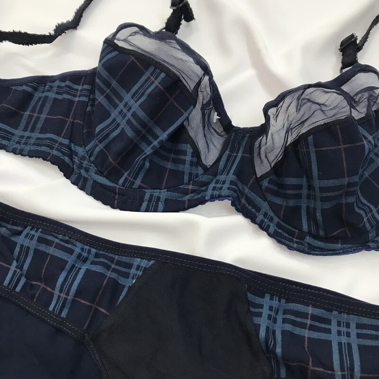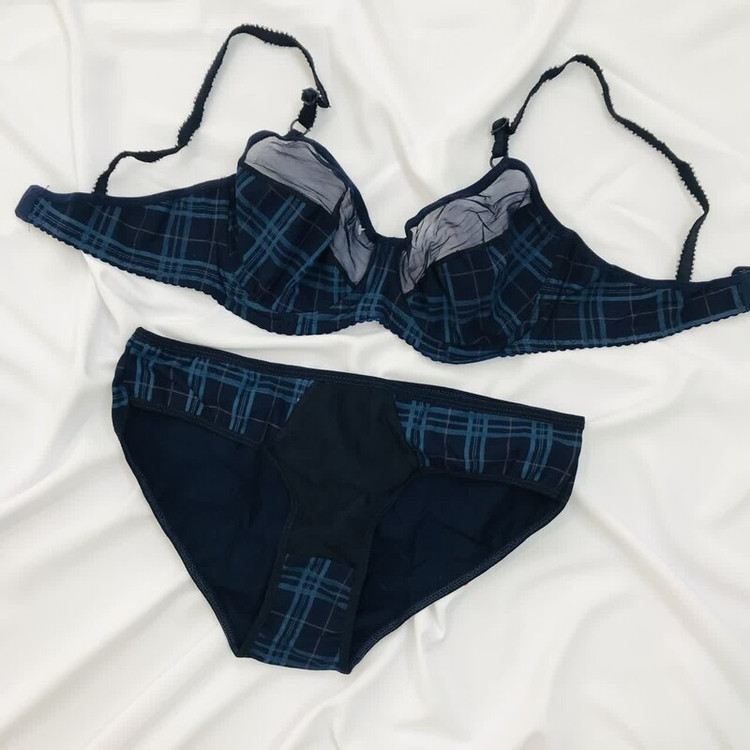 B ست سوتین و شورت نخی طرح باربری سورمه ای
