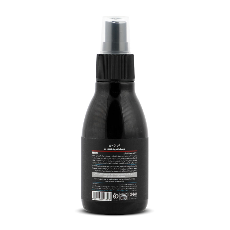 تونیک تقویت کننده مو MND عصاره برگ کهندار را در خود دارد که باعث افزایش طول عمر سلولهای موجود در فولیکول مو شده و محرک تولید فاکتورهای رشد مو است. بهعنوان مکمل، از کافئین نیز بهره گرفته شده است که تحقیقات علمی متعدد اثبات کردهاند که سطح انرژی سلولی در ریشه موها را افزایش داده و با تحریک تولید ترکیبات لازم برای رشد مو باعث افزایش تراکم موهای سر میشود. چون تامین مواد برای ریشه موها اهمیت فوقالعاده زیادی در رشد موها دارد، از عصاره پوست درخت دارچین نیز در این محصول کمک گرفته شده تا گردش خون در پوست کف سر بهبود یافته و فولیکولهای مو بهترین مواد را برای رشد، دریافت کنند. البته باید تاکید کرد به دلیل اینکه بیوتین نقش موثری در رشد مو دارد این ویتامین بهصورت مستقیم به تونیک اضافه شده است تا مصرف این محصول به تنهایی راهی برای تامین بیوتین برای ریشه موها باشد. باتوجه به اینکه هورمون DHT تولید شده توسط آنزیم 5-آلفا ریداکتاز، باعث ریزش موی ارثی میشود، عصاره کیگلیا آفریقایی به عنوان مهارکننده این آنزیم در محصول گنجانده شده تا به همراه عصاره برگ زیتون که بهبود دهنده نسبت فاز آناژن به کاتاژن در موهای سر است، باعث افزایش تراکم مو در سر شوند. چون آلودگی محیطی با ایجاد التهاب در پوست سر، موجب تسریع و تشدید ریزش موی سر میشود از عصاره ریشه آنجلیکای کرهای و بیوساکارید-گام 4 نیز برای ممانعت از این مشکل استفاده شده است.