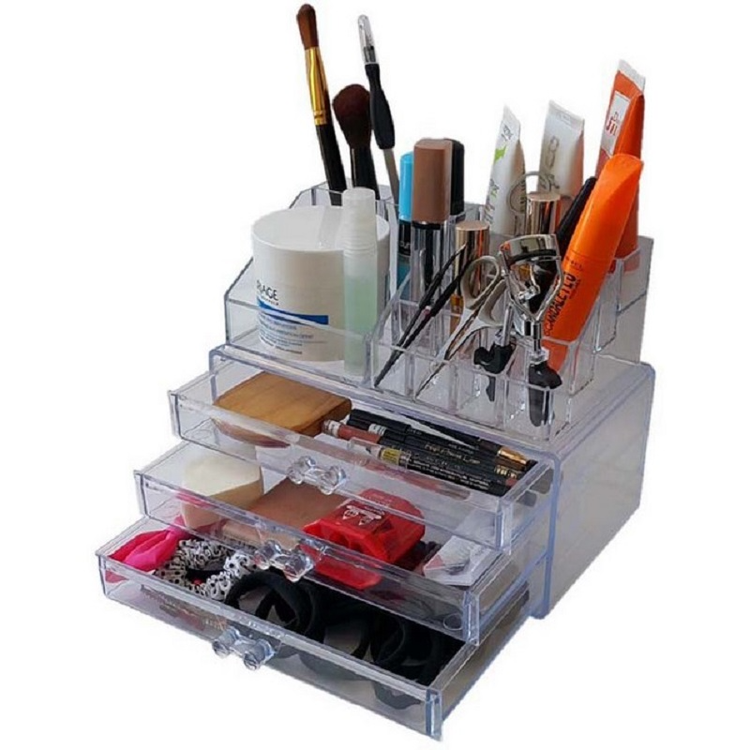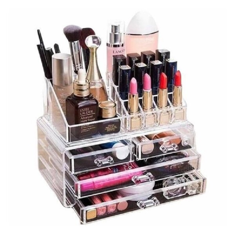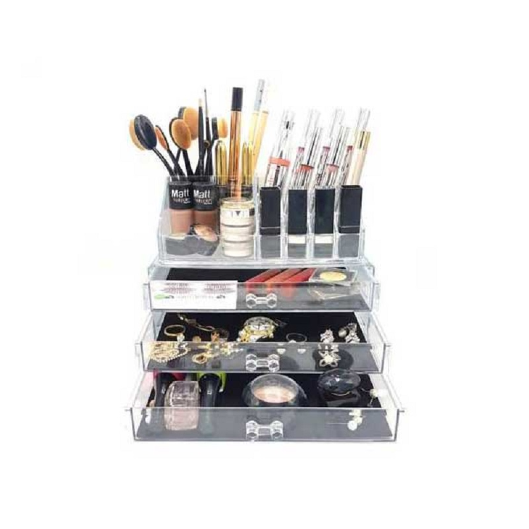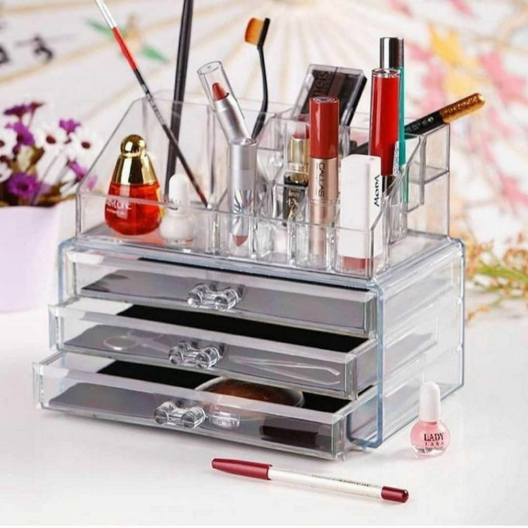 جنس اکرولیک شفاف درجه یک ابعاد 18*14*23 سانتی متر کاربرد استند لوازم آرایش 3 کشو بسیار مناسب جهت استفاده در منزل و آرایشگاه ها , قابلیت قرار دادن روی میز آرایش یا داخل کشوی میز , نظم دادن به لوازم آرایشی و یا زیورآلات سایر ویژگی ها دارای 16 قسمت تفکیک شده و پلکانی در بالا , دارای 3 کشو در قسمت پایه با دسته های زیبای کریستالی , طراحی زیبا و خلاقانه جهت نظم دهی کوچکترین ابزار آرایش تا بزرگترین وسیله ها مانند برس مو , طراحی شده مطابق با اشکال مختلف لوازم آرایشی , قابل شستشو , قابلیت جدا شدن قسمت بالای و برداشتن از روی کشوها برای استفاده به عنوان دو قطعه مجزا