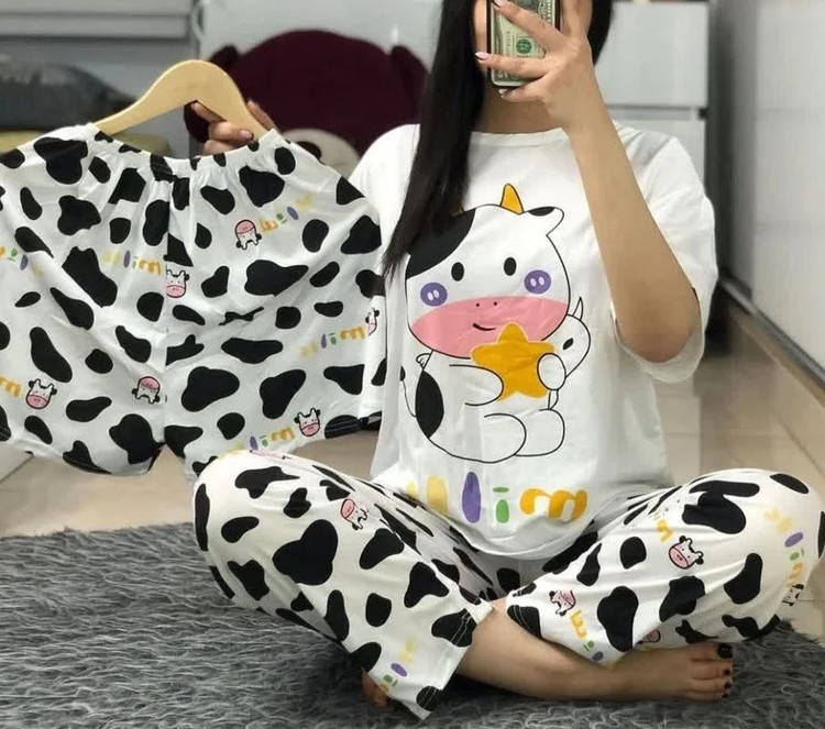 ست بلوز و شلوار و شورتک سه تکه کره ای طرح گاو ستاره دار کد 091