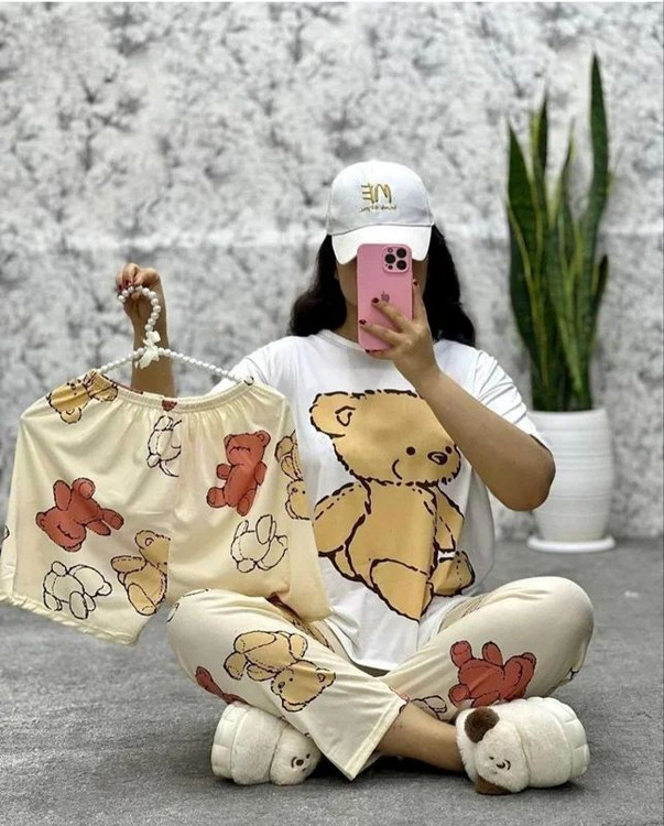 ست بلوز و شلوار و شورتک سه تکه کره ای خرس خردلی کد 091