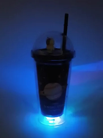 لیوان به همراه نی مخصوص عرضه میشود و چراغ آن با باتری ساعتی کار میکند که بهراحتی قابل تعویض است.
