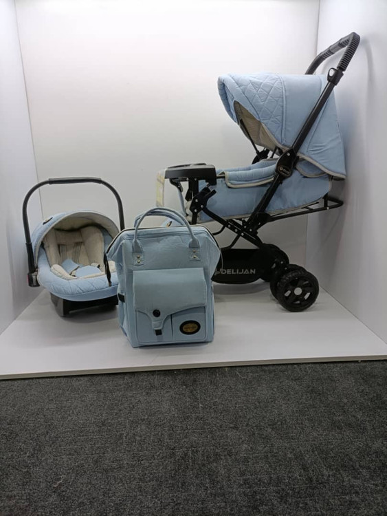 سرویس کالسکه دلیجان مدل کوله پشتی دسته رو به مادر پشت به مادر رنگ آبی آسمونی(آبی کم رنگ)
