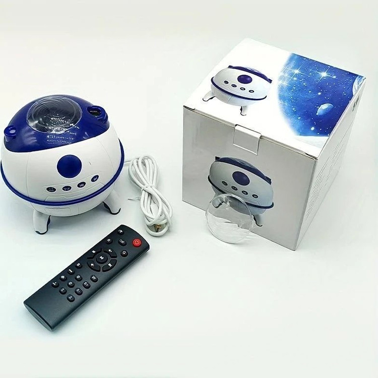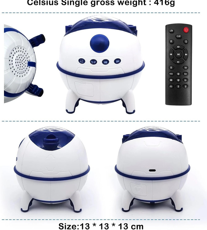 توضیحات کنترل : دکمه on و off / دکمه خاموش دستگاه /دکمه on و off موزیک /دکمه on و off نور /دوتا دکمه Rو G برای رنگ را بصورت کلی قرمز یا سبز میکنه / دکمه ولوم صدا /عقب و جلو کردن موزیک / stop و play موزیک / 8 دکمه برای تغییر نور کهکشان