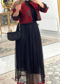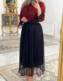 قد کت این ست حدودا 45 سانتی متر و قد دامن 95 سانتی متر است پایین تور دامن نوار دوزی دارد استین ها هم تور کار شده است .🥰😁