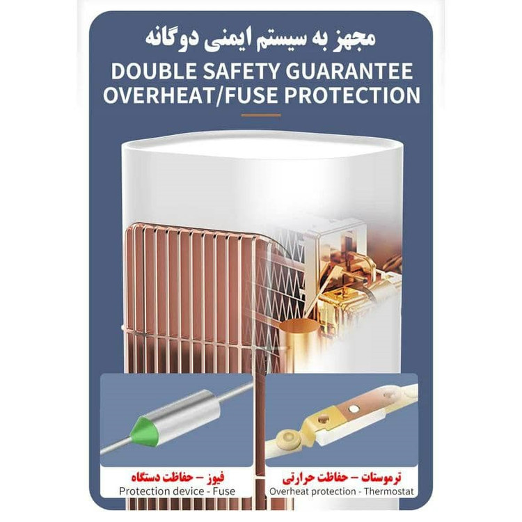 کلید ایمنی (سنسور ) آن موجب میشود که از آتش سوزی جلوگیری شود سنسور جوری طراحی شده که به محض ضربه خوردن یا افتادن به صورت خودکار خاموش میشود ویژگی خاص فن دار بودن آن است و در دو سطح دور کند گرمای متوسط و دور تند گرمای زیادی را به شما عزیزان منتقل میکند