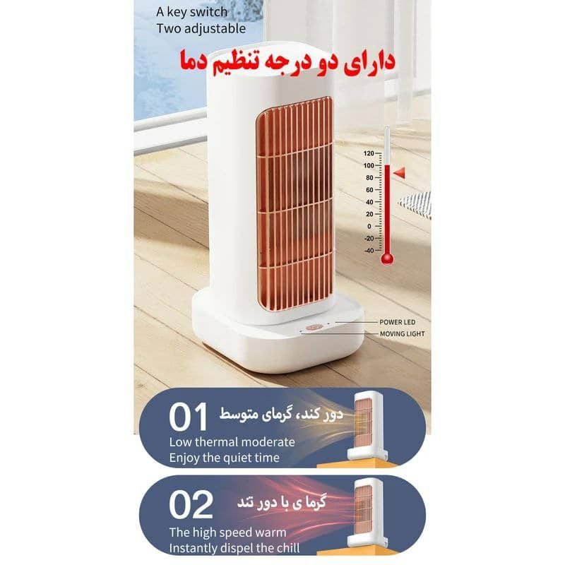 المنت سرامیکی PTC با توان 1300وات در زمان کوتاه محیط را گرم میکند چرخش دستگاه باعث میشود گرما بهصورت یکنواخت در تمام نقاط پخش شود، پایه دستگاه ثابت و بدنه قابلیت چرخش دارد. زاویه چرخش دستگاه 90 درجه میباشد.