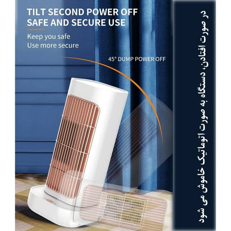 کلید ایمنی (سنسور ) آن موجب میشود که از آتش سوزی جلوگیری شود سنسور جوری طراحی شده که به محض ضربه خوردن یا افتادن به صورت خودکار خاموش میشود ویژگی خاص فن دار بودن آن است و در دو سطح دور کند گرمای متوسط و دور تند گرمای زیادی را به شما عزیزان منتقل میکند