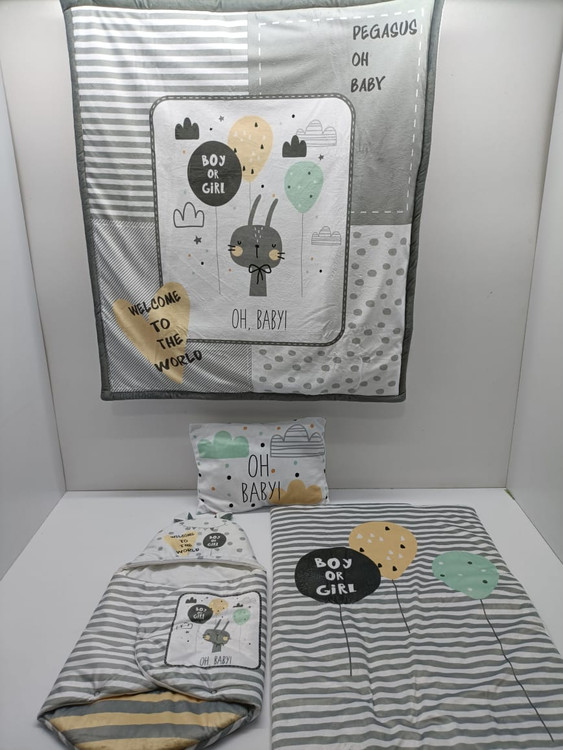 این سرویس خواب دارای یک عدد بالشت ، یک عدد تشک کوچک ، یک عدد لحافت کوچک و یک قنداق فرنگی می باشد . جنس همه آنها ازمخمل طرح دار عالی و دارای الیاف ضد حساسیت مناسب برای نوزادان می باشد. همچنین این سرویس قابلیت شستشو و تثبیت رنگ دارد .