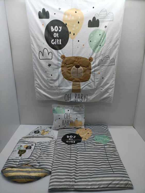 این سرویس خواب دارای تکه دوزی می باشند و دارای تکه دوزی خرسی برجسته نیز هست . این سرویس خواب رنگبندی متنوعی برای نوزادان پسر و دختر دارد . این محصول درون یک عدد کیف ( کاور )سلفونی بزرگ قرار گرفته است