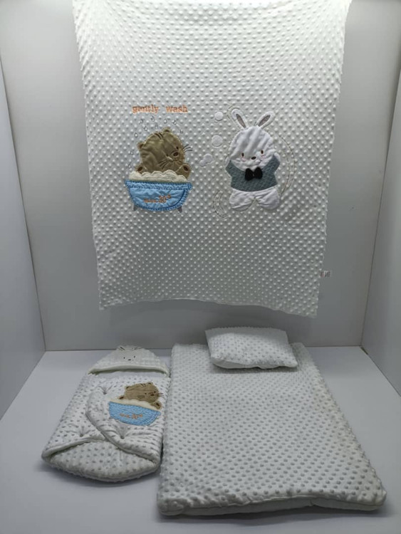 این سرویس خواب دارای تکه دوزی می باشند و دارای تکه دوزی خرسی برجسته نیز هست . این سرویس خواب رنگبندی متنوعی برای نوزادان پسر و دختر دارد . این محصول درون یک عدد کیف ( کاور )سلفونی بزرگ قرار گرفته است