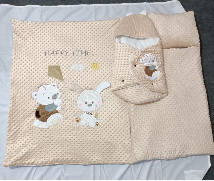 این سرویس خواب دارای تکه دوزی می باشند و دارای تکه دوزی خرسی برجسته نیز هست . این سرویس خواب رنگبندی متنوعی برای نوزادان پسر و دختر دارد . این محصول درون یک عدد کیف ( کاور )سلفونی بزرگ قرار گرفته است