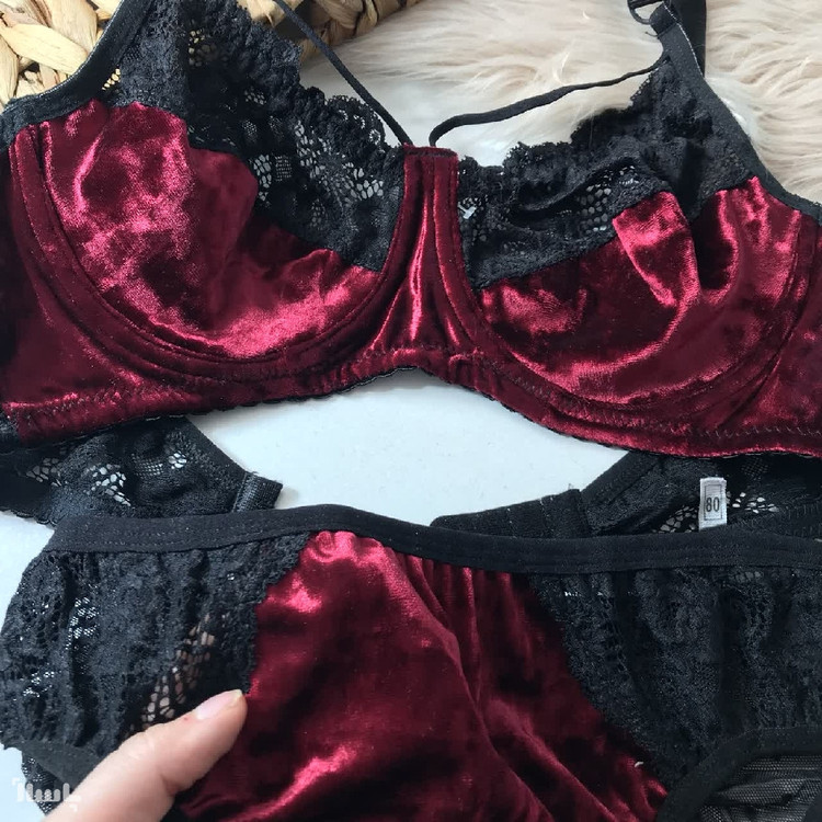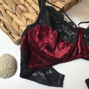 ست شورت و سوتین مخمل و دانتل برند شارمین رنگ زرشکی